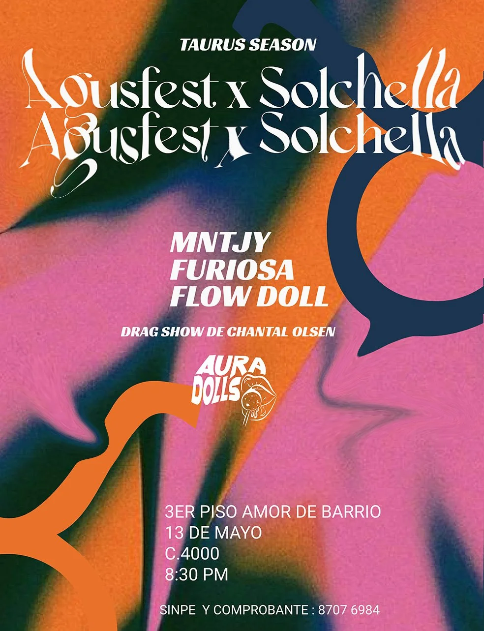 Agusfest x Solchella 13 de Mayo3er piso Amor de BarrioMusica por:Mntjy - Furiosa - FLOW DOLLDrag show porCHANTAL OLSEN C. 4000 COMPRAR ENTRADA COMPRAR ENTRADA